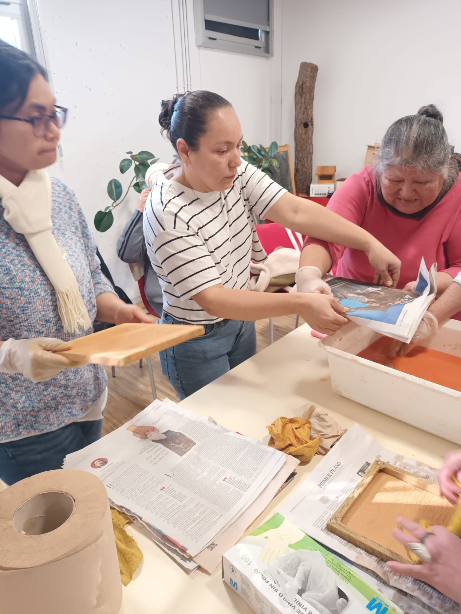 El miércoles 26 participamos de una actividad en la Dehesa de la Villa. Fue un taller muy divertido. Maribel, la persona encargada del centro ambiental, nos enseñó a hacer papel reciclado con papel de periódico usado. Para hacerlo solo usamos papel de periódico, una bandeja grande con agua, cribadores, bayetas, y colorantes. Cuando se seque, podremos traer el papel a casa y utilizarlo para hacer una bonita tarjeta. En este centro también tiene plantas que se pueden adoptar. Algunas chicas adoptamos algunas de las plantas, que cuidaremos muy bien en casa. Como siempre, terminamos la actividad tomando café bajo el sol. Lucky Walidi (Comisión de Interculturalidad)