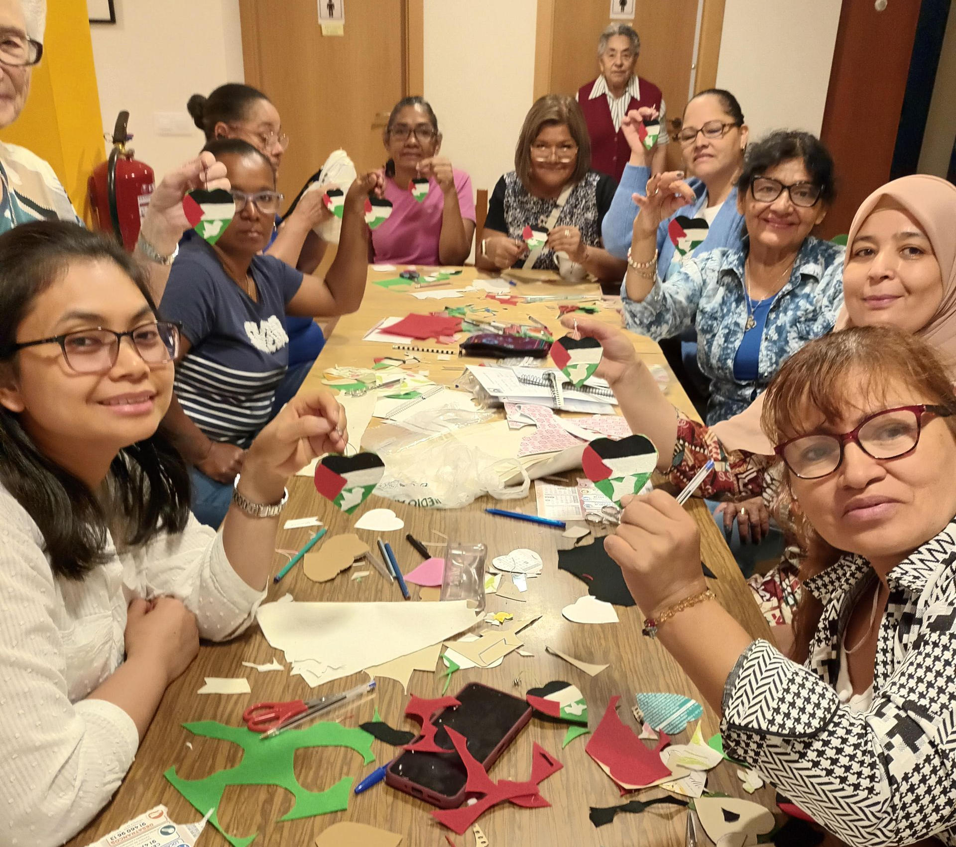 "Hoy hemos regresado al curso de manualidades. Mis compañeras y yo hemos aprendido con la profe Gema a hacer un llavero: un corazón con colores de la bandera de Palestina. En mi caso lo he llevado puesto en mi bolso, ha salido muy bonito.